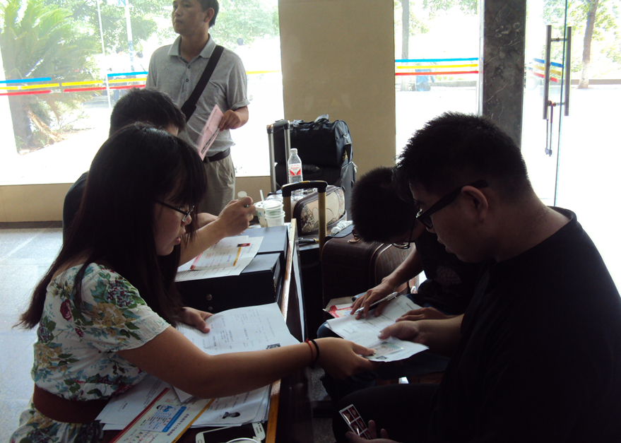 31日早上7:45,值班同学替换走了在迎新岗位上已经坚守了一晚的优秀党员,新的一天的迎新工作又正式开始。随着太阳的升高,南华广场上陆续热闹起来,各迎新点也逐渐忙碌起来。广场上迎新点的同学们面带微笑,为学弟学妹们做引导,带领他们前往九教大厅报到。大厅里亦是一片热情,信息搜集组和材料整理组的同学认真而有序的为新生服务,还有专门负责为学弟学妹搬行囊的同学,他们给家长送座,倒水,忙的不亦乐乎,然而整个过程却井然有序,忙而不乱。PA官方平台的彭建南书记还拿出了他的相机,为新生和其父母合影留念,对他们的到来表示热烈的欢迎。