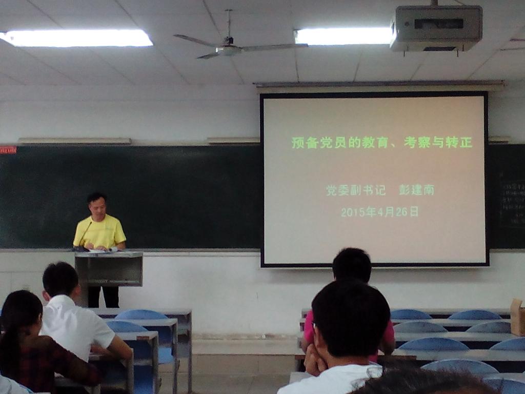 4月26日下午3:00PA官方平台党委副书记彭建南于9-302教室,给学生党员上党课,主要讲《预备党员的教育、考察与转正》,本科学生党员和研究生党员到课学习。