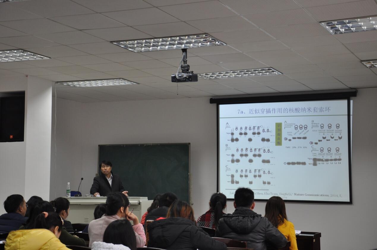 报告会上,吴再生教授主要讲述“核酸纳米器件与生命分析”、“金属纳米材料与生物传感”这两个方面。首先介绍了目前该领域的研究方向和状况,然后生动地讲解了介稳态核酸纳米片、近似穿插作用的核酸纳米套索环等核酸纳米器件的形成机制和作用机理,接着又详细地说明了金属纳米富集与近距离牵引扩增电化学传感技术和金属纳米材料的表征方法。报告接近尾声时,研究生与吴教授还进行了愉快地交流,吴教授对在场师生的提问做出详细解答,他精彩讲座和严谨的科研态度使在座的各位师生受益匪浅,赢得了大家热烈的掌声。