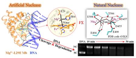 人工核酸酶分子在生物技术和生物医药领域,特别是在基因工程和新型抗菌抗病毒等试剂的发现中具有重要的应用。然而,很少有人工核酸酶分子既能切割又能降解核酸DNA分子。近日,PA官方平台林英武教授课题组在国际催化领域权威杂志《ACS Catalysis》(中科院一区; IF=12.35)发表研究成果——《Rational Design of an Artificial Nuclease by Engineering a Hetero-Dinuclear Center of Mg-Heme in Myoglobin》,同时申请了国家发明专利。