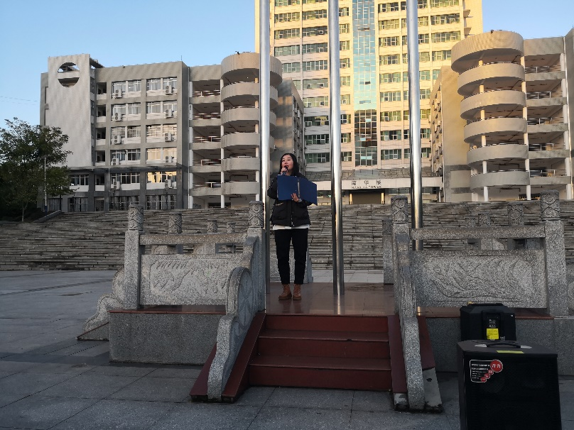升旗完毕后,化工专业1902班孙果同学进行国旗下的演讲。孙果首先讲述了自己光荣加入中国共产党的感受,通过学习党史,切身体会和领悟到中国共产党的精神内涵。接下来,孙果向全体同学发出倡议:“鼓励大家从学习作风、家国情怀和责任担当等方面继承优良传统,并发出“请党放心,强国有我”的铮铮誓言。”