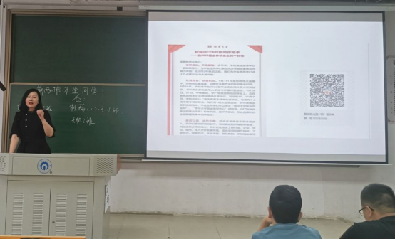 陈楠老师通过将学院往届毕业生的就业以及考研状况与本届毕业生的就业摸底情况进行对比,讲解就业形势、考研现状以及企业待遇,建议应届毕业生们“走两条路”,可以在准备考研的同时考虑签约企业。