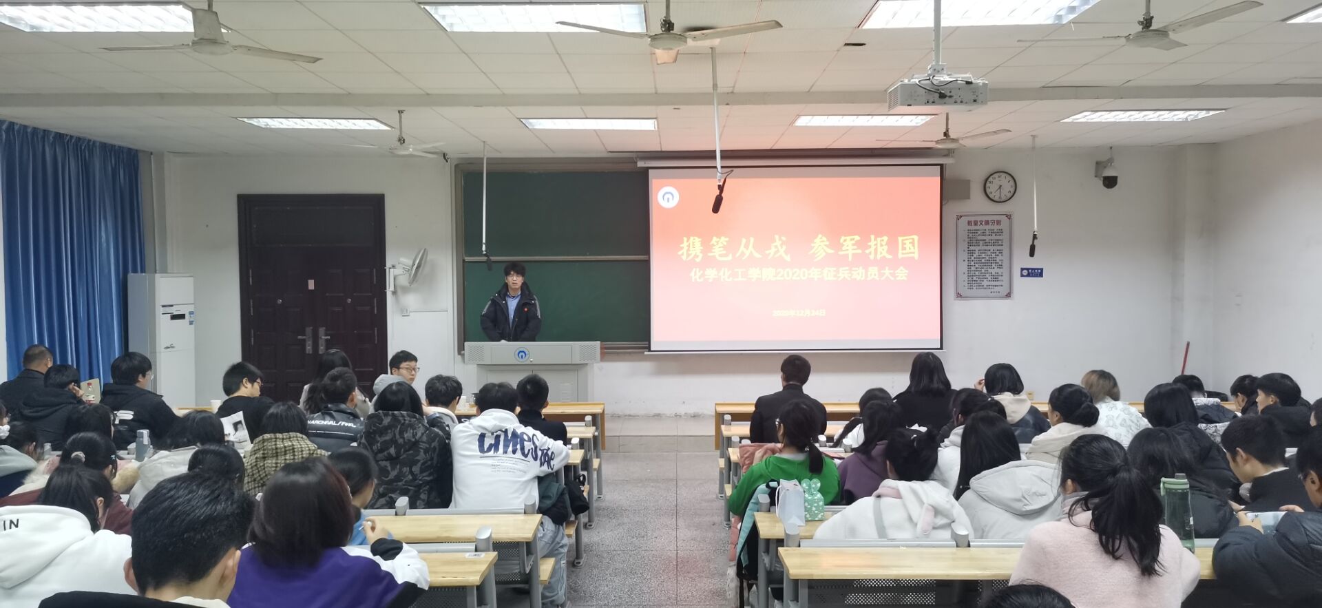 为认真做好本年度大学生征兵工作动员,多措并举引导学生响应国家号召,应征入伍,报效祖国,PA官方平台于12月24号在化工楼301教室举办了“携笔从戎、参军报国”2020年征兵动员大会。学工室主任陈楠,辅导员颜晔、2020级新生参加大会。大会由颜晔主持,特邀校武装部汪先利、最美大学生优秀退伍士兵黄程宣讲。