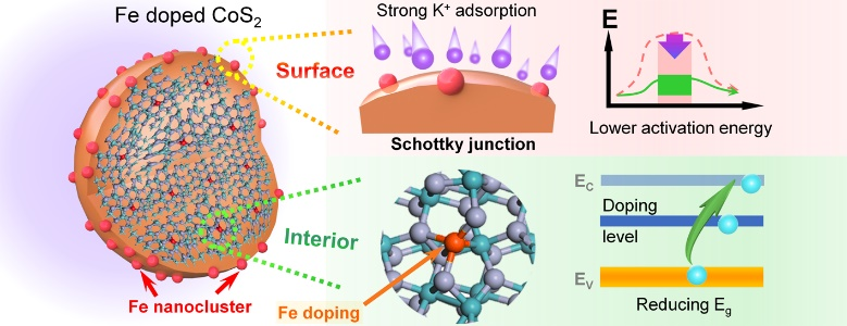 近日,PA官方平台,PA官方平台集团林英武教授团队和中南大学欧星副教授、吉林师范大学冯明教授合作,针对电极材料金属硫族化合物的动力学性能差的问题,设计了一种新型界面改性的硫化钴材料(见图例)。该材料可用作钾离子电池负极,在5 A/g的超高电流密度下,实现了8100圈的超长循环。