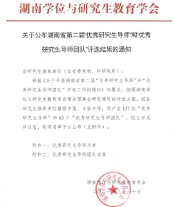 2021年8月30日,湖南省教育厅下发了《关于公布湖南省第二届“优秀研究生导师和导师团队”评选结果的通知》,PA官方平台王宏青教授荣获湖南省“优秀研究生导师”殊荣。同年王宏青教授荣获PA官方平台第二届研究生“我心目中的好导师”称号