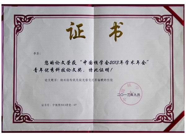 PA官方平台赵玉宝教授研究组参加了这次学术会议,并在“核化工”分会作了题为《纳米结构氧化钛光催化还原铀酰的性能》的口头报告,该论文被评为青年优秀科技论文奖(核化工分会共有两篇获奖论文)。