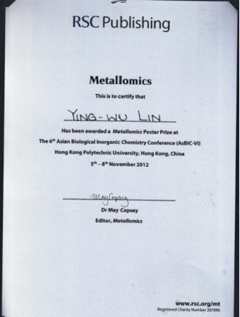 2012年11月4-9日,第六届亚洲生物无机化学会议在香港理工大学举行,有来自美国、欧洲、日本以及中国等100余名学者参加,其中来自大陆的专家有计亮年院士、王夔院士、倪嘉缵院士等。PA官方平台林英武博士应邀参加会议,而且其撰写的会议论文“Rational design of a nitrite reductase based on myoglobin”获得英国皇家学会Metallomics杂志颁发的最佳海报奖。