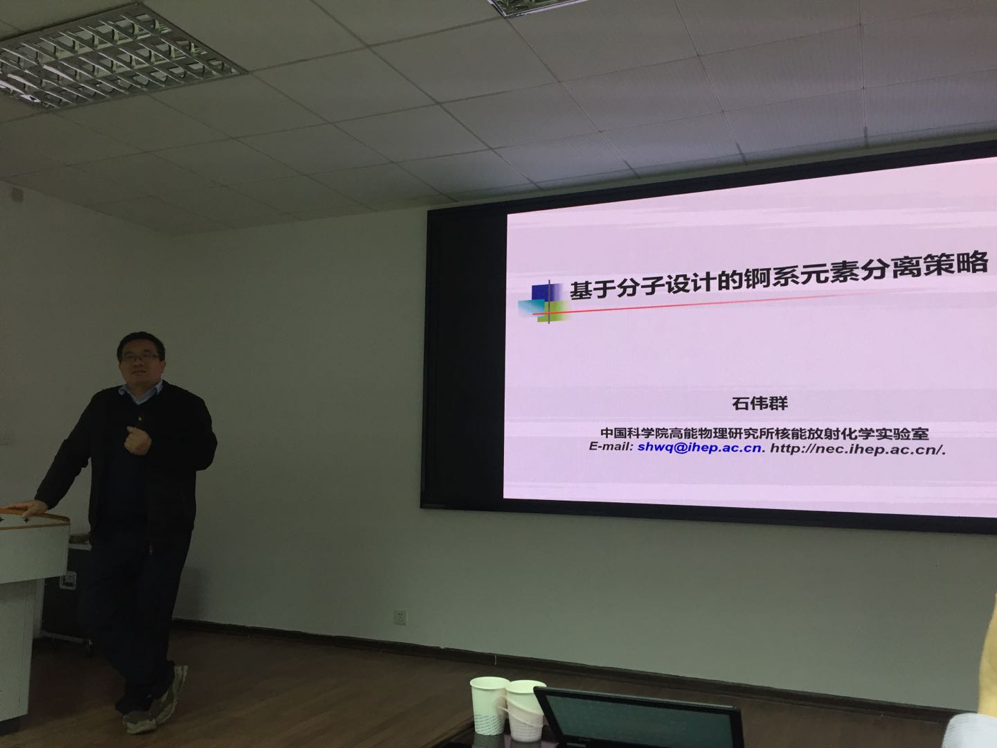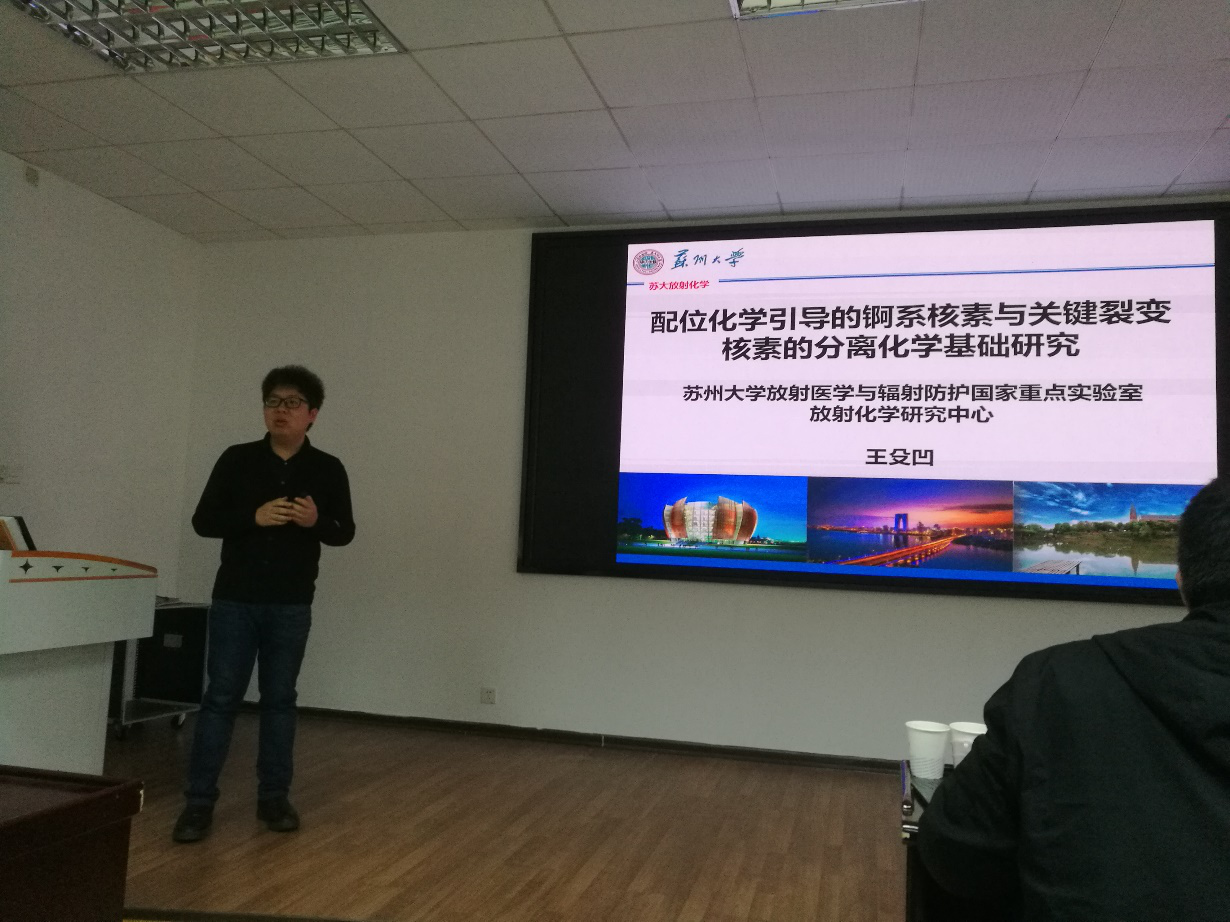 王殳凹教授首先从元素周期表的诞生向在座师生介绍了放射性核素的发展过程以及核素的物理、化学特性,核燃料的循环过程和核能放射性污染防治基础研究目前存在的难题。接着王殳凹教授介绍了该课题组近两年在冠醚类化合物以及多酸类化合物在放射性核素固化和分离中的研究及应用。运用实验配位化学及理论研究,利用大环配体和多酸配体的孔穴效应和位阻效应在氧化还原过程中形成稳定的钚非常规价态的方法,获得稳定的五价钚化合物晶体结构成为国内首创的科研成果。钚的基础及应用研究能为国防安全、乏燃料后处理、高放废物地质处置、核事故应急等提供重要的科学依据。