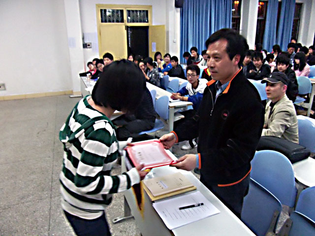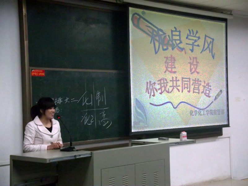 首先,主持人播放PPT,详细地阐述了学风的含义。接着,制药091班团支书与大家分享了如何充分地调动班级积极性、形成良好班级学风的经验。随后,刘老师及赵老师分别介绍了学院的就业、考研情况及学风建设情况,并对同学们如何树立崇高人生观、如何创建学风提出具体意见和看法。最后,副书记彭建南对本次讲座作了简要总结,鼓励同学们提高求知主动性,积极建设良好的班级、院级学风,做到班级团体、学院团体共同进步。此次讲座之前,院宿管部还进行了为期三天的不定期宿舍检查,评选出了学风建设优秀寝室,并由领导为其颁发流动红旗,以作鼓励。
