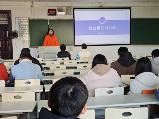 会议分为三个议程。首先由班长周超讲解毕业相关事宜,并重点强调了毕业论文检测、预答辩、送审盲评、正式答辩等关键时间节点;接下来,研究生分管辅导员熊露围绕前期同学们的相关咨询,对就业协议书的签订与更换流程做了详细说明;最后,学院党委副书记余晓秋结合此前前往深圳、南京等多地进行就业市场调研的收获,以及12月份进行的PA官方平台2026届研究生就业意向与求职状态调查结果,有针对性地为同学们讲解了国家、地区、学校等各个层面的相关政策,并提出了定期跟踪求职状态、督促并指导制作个人简历、拓展招聘信息渠道、根据就业意向精准投递等建设性举措,为同学们提供有力的就业服务与保障。