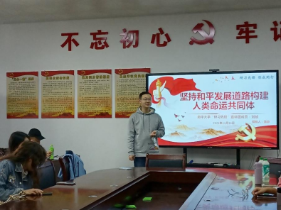 刘桢同志以“坚持和平发展道路,构建人类命运共同体”为主题,以中国对“国强必霸论”的有力回应、参与新冠疫情防控以及脱贫攻坚战的全面胜利为代表说明了中国坚持走和平发展道路。他说习近平总书记在构思人类命运共同体时,创立了利益共同体、责任共同体和命运共同体概念,利益共同体作为逻辑起点,责任共同体作为逻辑诉求,命运共同体作为逻辑结论,反映了客观现实的要求,体现了客观规律的走向,并结合中国一带一路的建设、发展外交关系以及反霸权主义和强权政治,说明中国大力弘扬和平、发展、公平、正义、民主、自由的全人类共同价值,积极推动构建人类命运共同体。